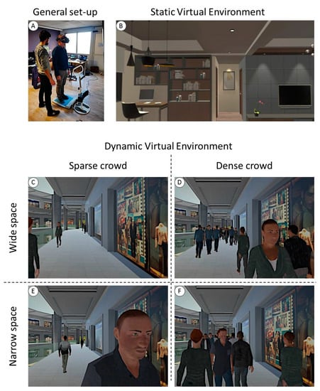 General experimental setup (A), static virtual environment (B), and dynamic virtual environment in sparse crowd and wide space (C), dense crowd and wide space (D), sparse crowd and narrow space (E), and dense crowd and narrow space (F) conditions.