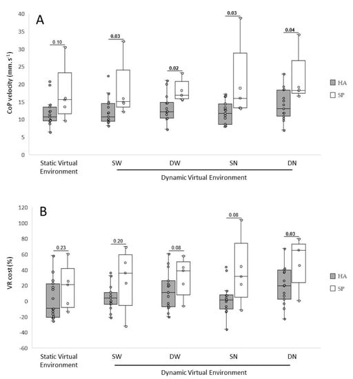 In addition, it has been reported that attentional demand increases in SP compared to HA, especially when conditions become more challenging []. In a near-infrared spectrometry study, Hinderaker et al. [] showed that attentional cost, illustrated by prefrontal cortex activation modulation, rose in older adults under challenging balance conditions. This process may be exacerbated in SP and could be partially related to postural control alteration in a challenging VR environment. VR permits a standardized and reproducible environment that can be used to present ecological situations [] and can provide an additional assessment by observing SP behavior in daily living activities.
