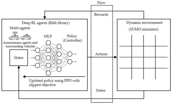 DNN, which is a generalization of an artificial neural network (ANN), is able to extract features autonomously with respect to the representations of multi-hidden layers. To enhance the continuous tasks, the MLP, which was proposed by Rumelhart et al. [39], is applied to create the set of acceleration actions based on the updated states (the output of the SUMO simulation over every time step). Additionally, the PPO is used to improve the DRL performance. In this work, the advanced DRL method, which is the integration of RL and MLP, is used to evaluate the efficiency of leading AVs in the urban network along with nine non-signalized intersections. Firstly, the SUMO simulator conducts one time step. Secondly, the RL library (RLlib) trains and generates the set of acceleration policies according to the updated states of the SUMO simulator through the Flow tool. The objective learning of the MLP policy is to optimize the acceleration policy in terms of the set of observations. Figure 1 shows the DRL-based multi-agents in the urban network [35].