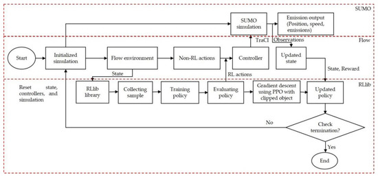 In this work, we apply the DRL method for closed-loop online optimization. This method integrates the SUMO simulator with DRL agents (RLlib library) by adopting the Flow framework. As shown in Figure 2, the advanced method’s architecture consists of three parts: First, the SUMO is the environment simulator that executes realistic experiments in time steps. Second, the Flow tool integrates the SUMO environment and the DRL agents. Third, the RLlib library optimizes the cumulative reward based on the SUMO simulator’s state. Finally, the simulation resets and iterates the DRL processing [35].