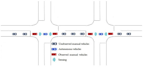 Creating a smoother and safer road network is a crucial purpose of traffic management agencies and researchers that has led to various studies about different transport aspects. According to a road safety report in Korea, urban roads made up 51.1% of traffic-related deaths in 2019. In addition, intersection collision is a complicated type of road accident, comprising 49.8% of junction collisions in Korea in 2019 [1]. Furthermore, the number of collisions at an un-signalized junction is higher than that at a signalized intersection due to a higher collision rate and more complex interactions. The traffic rules of signalized intersections are usually disrupted by careless drivers. Autonomous vehicles (AVs) can operate with less human intervention or without human drivers through integrated sensors—namely, radar, lidar, and three-dimensional (3D) cameras, etc. They have become a promising approach to prevent human error and enhance traffic quality, and full automation vehicles are expected as quickly as 2050 [2]. Intersections are also the main issue in applying autonomous driving technologies, especially for non-signalized intersections. The autonomous vehicle (AV) classification defines six levels ranging from level zero (no automation) to level five (full automation) according to the Society of Automotive Engineers [3]. To push AVs into the real world, the Cooperative Intelligent Transport Systems (C-ITS) were designed to communicate information between transportation means and road infrastructures. Furthermore, advanced driver assistance systems (ADAS) that can help vehicles detect numerous dangerous situations, activate autonomous driving mode, or alert drivers have been applied to connected and automated vehicles (CAVs). The ultimate purpose of ADAS is the full automation of technology. For example, Wu et al. [4] applied vehicle-to-vehicle (V2V) and vehicle-to-infrastructure (V2I) communications to the improvement of intersection movement assistance. Additionally, Philip et al. [5] applied the internet-of-things (IoT) to smart traffic control. This helped AVs automatically collaborate with the roadside unit and independently decide their speeds. Soon, AVs will share the road with human-driven vehicles (HVs). Hence, this study focuses on the mixed-traffic environment that interacts between HVs and AVs in an urban network with multiple un-signalized intersections.