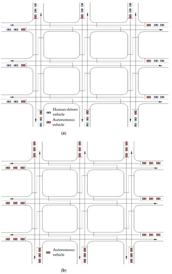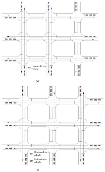 Leading autonomous vehicle experiments for the urban network: (a) mixed-traffic environment under autonomous vehicle (AV) penetration rates ranging from 20% to 80% in 20% increments; (b) full autonomy traffic with a 100% AV penetration rate.
