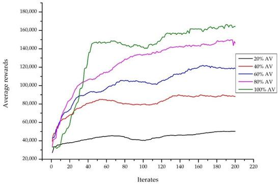 The average reward curve was applied to evaluate the DRL performance. Figure 7 presents the average reward curve over AV penetration rates. The smoothing of the curve of entire cases illustrates that the DRL policy totally converged. Additionally, when the AV penetration rate was higher, it obtained a superior average reward. Full autonomy traffic performed better than other AV penetration rates. This indicates that full autonomy traffic achieved the highest average reward of 135.611. Comparing the 20% AV penetration rate, full autonomy traffic performed 3.1 times better than the average reward. The results illustrate that the improvement in the average reward became much better when the AV penetration rate increased. Therefore, the efficiency of the leading autonomous vehicles became significantly obvious in the urban network when the AV penetration rate was higher.