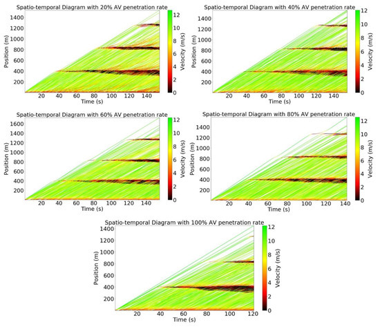 To evaluate the efficiency of leading autonomous vehicles in terms of the flattening velocity, the spatial–temporal diagram for the urban network over the AV penetration rates is shown in Figure 8. The points are color-coded regarding velocity. If the points are near the bottom, the traffic flow is more congested, whereas those near the top express a better traffic flow. Concerning the behavior of HVs, the congestion occurs with a lower AV penetration rate. As seen in Figure 8, almost all points approach the top as the AV penetration rate becomes higher. This means that the leading AVs can help to mitigate stop-and-go waves in an urban network. In contrast, almost all the points approach the bottom with lower AV penetration rates due to human-driven behaviors. Full automation traffic obtained a superior smoothing velocity in entire cases. Therefore, the traffic flow was less congested and smoother with a higher AV penetration rate.