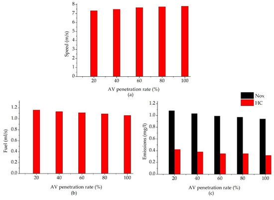 The results of the measures of effectiveness (MOE) evaluation over autonomous vehicle (AV) penetration rates: (a) average speed vs. AV penetration rates; (b) fuel consumptions vs. AV penetration rates; and (c) emissions vs. AV penetration rates. Nox: nitrogen oxide; HC: hydrocarbons