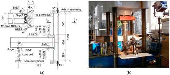 Two connections of identical geometry 2B and 3B were tested. For the tests, a 1000 t capacity press was used. Geometry of the joints is presented in Figure 1a. The characteristics of materials used for the tests were obtained experimentally and are presented in Table 1 and Table 2. Loading was divided into two steps. In the first step, an initial 50 t compression force in the column was introduced and maintained, then, in the second step, equal and opposite moments were induced by manually controlled hydraulic cylinders (Figure 1). The ends of the column were fixed; in contrast, the ends of the beams were not restrained.