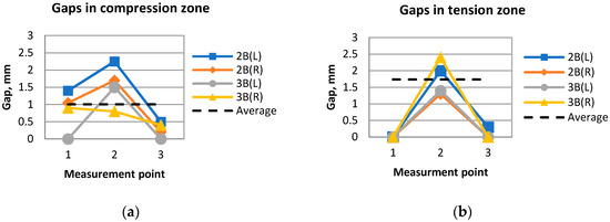 Bolts were tightened by applying the full-strength torque to establish firm contact between the column and the endplate; however, no firm contact could be achieved. The bolt tightening force was not measured or controlled by any means. After tightening, the gaps at the ends of the plates were measured with the feeler gauges at three points (two corners and in the middle in accordance with Figure 1). The measurements are presented in Figure 2.