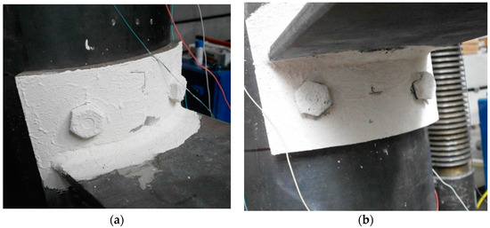 All joints failed in the tension zone either by punching shear (Figure 3a) or by fraction of the bolt (3B(L)). Non-fractured bolts from the tension zone were heavily bent (Figure 3b), fractured bolts did not exhibit necking. Due to flaking of the limewash near the weld, plastic deformations in the middle of the top flange were visible (Figure 4a). In contrast, the limewash layer was intact in the tension zone (Figure 4b).