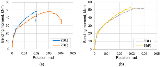Moment rotation curves: (a) Connection IIB; (b) Connection IIIB (L—left side; R—right side).