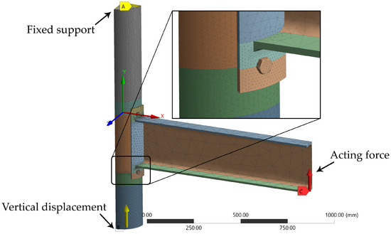 Simulations were performed in the ANSYS Static Structural analysis system. With account of the symmetry, only a quarter of the model was analysed, which then was meshed with the higher-order tetrahedral ten-node SOLID187 elements (Figure 6). After performing a mesh convergence study, different mesh sizes were used: 3 mm for bolts; 5 mm for extended parts of the endplate; 15 mm for the middle part of the endplate; 2.5 mm for fillet welds; 10 mm for the steel tube; 15 mm for the middle part of the concrete core. For the other parts, the default global mesh size of 83 mm was left. Additionally, mesh refinements were implemented near the wealds and in the tension zone of the steel tube. In these critical areas, mesh size was decreased in such a way that the endplate and the bolt hole would be meshed with four layers of elements along their thicknesses, which exceeds recommendations of Molitoris et al. [29]. Another plausibility of assessing the mesh quality is to directly compare FEA results with the experiments [30,31].