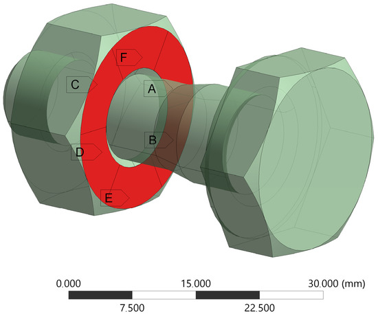 Fourteen frictional contact pairs were introduced: between the endplate and the column; the bolt heads and the endplate; the nuts and the inner surface of the column; the bolt shanks and the bolt holes; the concrete and the inner surface of the column. Additionally, the nut of the bolt in tension zone was split into six surfaces (Figure 8) to even out concentration of the force. Augmented Lagrange formulation was used for all contacts with stiffness update at each iteration. The initial contact interface treatment was set to the “adjust to touch” option and all friction coefficients were set to 0.2.
