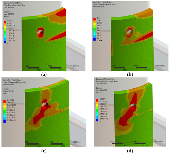 Plastic strains in the compression zone of the endplates with different gaps: (a) −1.4 mm; (b) 0.0 mm; (c) 1.48 mm; (d) 3.63 mm.