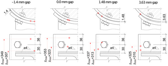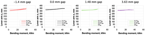 The position of the compression centre is mainly defined by the gap location (Figure 12). Due to the rotation of the joint, it was not constant and moved outwards. This resulted in the connection with the gaps at the corners’ internal lever arm being increased by 14%. In other connections, the increase was smaller.