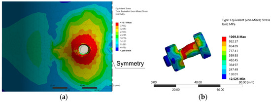 Regardless of the preloading force and the gaps, failure mode of the numeric simulation was the punching shear of the bolts (Figure 13a). It can be seen from Figure 13b that bolts also experienced bending, as von Mises stress values in the half of the shank reached the ultimate stress.