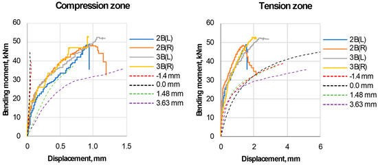 Horizontal displacements of the tension and compression zones for the joints with the bolts which were preloaded to 0.7 fub (L—left side; R—right side).