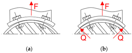 Based on the Theory of Shells, it is known that curved plates develop thrust to resist the applied loads. The same happens in curved endplates, in which bolts are not only in tension, but also in shear. The degree of tension/shear force vastly depends on the flexibility of the plate and support conditions of the bolts: if bolts could move easily, then thrust would not develop. Thrust force decreases the axial load of the bolts and increases their shear. Because of this, conventional prying models are not suitable for the general case of the curved T-stub. Moreover, this also applies to the use of the Eurocode [27] expressions for determination of the effective flange length, particularly in the case of estimation of the initial stiffness of the T-stub [28].