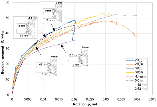 The experiments showed that the average initial rotational stiffness of the joints was 17,381 kNm/rad with standard deviation of 3293 kNm/rad and the ultimate bending moment capacity of 50.48 kNm with deviation of 2.41 kNm. Moment–rotation curves are shown in Figure 5.