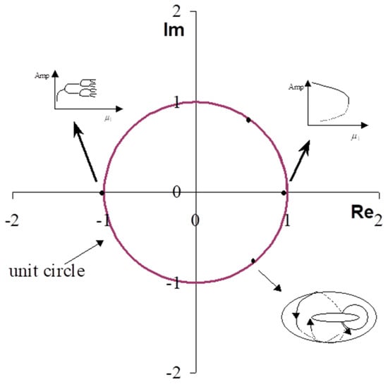 Unit circle—diagram showing basic periodic orbit bifurcations—periodic orbit bifurcations. 1. The actual eigenvalue exceeds +1. Periodic limit points appear in this case. 2. The actual eigenvalue exceeds −1. Period doubling bifurcation occurs in this case. In the proximity of this point, a stable periodic orbit with a period of T becomes unstable and a new stable periodic orbit, with a period of 2T appears. This type of stability loss leads to chaotic motions. 3. Two conjugated eigenvalues leave the unit circle. Stable or unstable trajectories surround an unstable bifurcation orbit [].