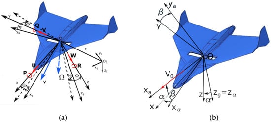 Coordinate systems rigidly associated with the object (MAV for example) or associated with the inflow of air streams, and their combinations are usually selected to represent motion equations in aviation. Figure 2 shows coordinate systems, used to derive aircraft motion equations. Details of deriving aircraft motion equations can be found in numerous textbooks and monographs (e.g., [,,,,,]), which is why will not discuss them in this work. Below you can find micro aerial vehicle motion equations expressed in a so-called-semi constrained coordinate system. This means that centre of mass motion equations are written within a velocity system of coordinates (Figure 2b), while the equations of MAV spherical motion relative to the centre of mass are written within a system related to MAV axes of inertia.