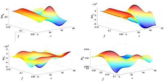 Examples of aerodynamic derivative waveforms as function of angle of attack α, and reduced frequency f [].