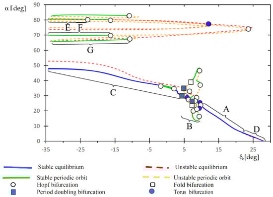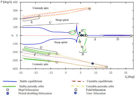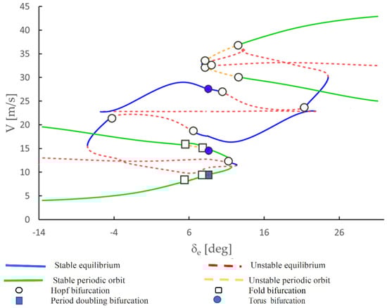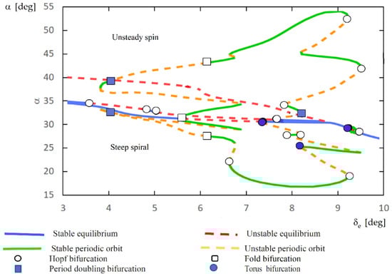 A bifurcation can be defined as a qualitative change in the system dynamics as a parameter is varied. In flight dynamics, a qualitative change is usually understood as a change in the stability of the aircraft. Bifurcation analysis and continuation methods are based on the principles of the dynamical system theory. The basis of the dynamical systems theory are described in many books (it can be mention here: [,,,,,]). These methods consist in finding and tracking solutions numerically, in a selected range of parameters, in order to generate bifurcation diagrams. Bifurcation diagrams allow to identify qualitative changes in the dynamic response of the system.