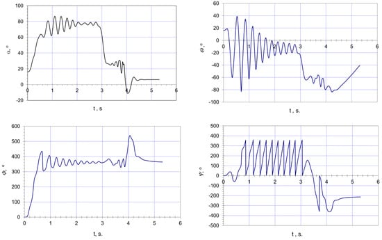 In the course of implementing a mathematical dynamics model of an aircraft into MATLAB Dynamical System Toolbox, it is more convenient to present aircraft centre of mass motion equations in a velocity coordinate system Oxayaza (Figure 2) []. Furthermore, the equations omitted the aircraft yaw (heading) angle Ψ and the aircraft centre of mass position relative to the system related to the Earth, since these values do not influence the dynamic properties of an aircraft []. This enabled the state vector dimension to be reduced to eight components: