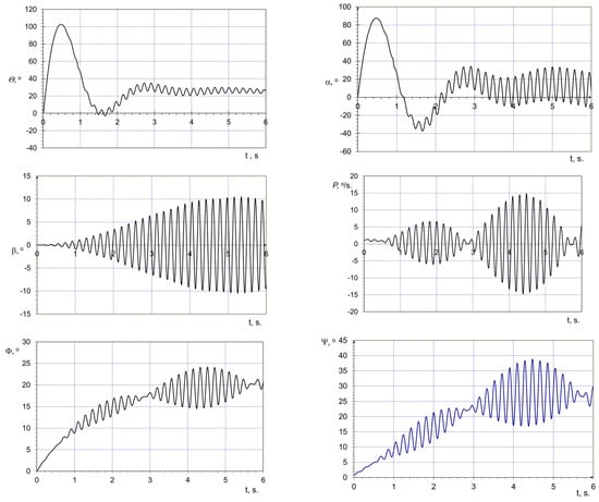 The general form of the micro-airplane motion equations takes the form of autonomous differential Equation (1). Components of vector f have the form [,,,,]: