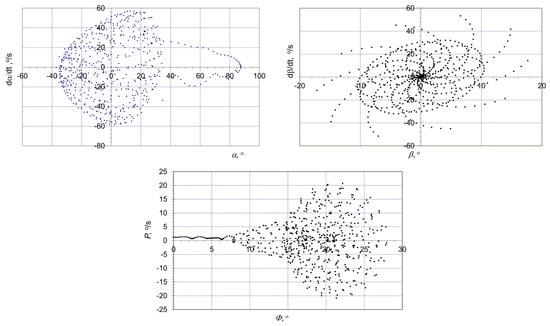 At the starting point of the continuation analysis (δe = 20°, α = 3°), the aircraft was conducting a steady symmetrical flight. As the elevator deflection angle changed, the elevator angle of attack initially increased, and the deflection angular velocity remained at zero. This dynamic regime was denoted with the letter A. Its corresponding range of angles of attack is 2° < α < 25° (Figure 5 and Figure 7). The range of steady states denoted with the letter A corresponds to a symmetrical flight of the MAV (angular velocity P = 0). When the elevator deflection angle decreases below δe≈10 and the angle of attack α ≈ 28 degrees, the micro aerial vehicle enters the dynamics regime denoted with the letter B, with both anti-symmetrical, as well as symmetrical motions. They can be associated with unstable Dutch roll, wing-rock oscillations, spiral motion instabilities, as well as unstable phugoids. Ant-symmetrical oscillations result from Hopf bifurcations in B. In this area, when the elevator deflection angle continues to decrease, reaching a value of δe ≈ 4° and α ≈ 34°, the spiral mode loses stability, which leads to the bifurcation of the stable and almost symmetrical solution. Two asymmetrical equilibrium position branches appear. At higher angles of attack, the spiral model becomes unstable along the almost symmetrical solution branch.