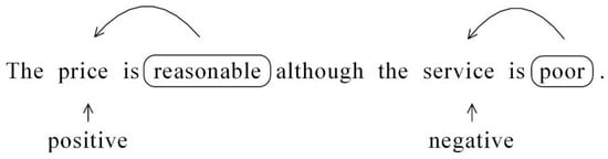 Aspect-based sentiment classification (ABSC) is a key subtask of sentiment classification [], which is a fine-grained task in the field of text sentiment classifiction. Its objective is to determine the sentiment polarity (such as positive, negative, and neutral) of aspects that appears in a sentence. As a specific example, Figure 1, this sentence expresses positive sentiment about food prices, but it expresses negative sentiment about service.