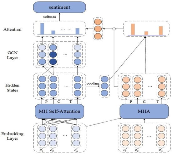 where  is the attention weight matrix,  is the output representation of GCN. The above formula is used to calculate the semantic relevance of the aspect and context words. The final representation of the forecast: