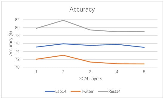From Figure 3 and Figure 4, we can observe that Accuracy and Macro-F1 fluctuate in the same trend on Rest14 and Twitter datasets as the number of GCN layers changes. In the three datasets, Rest14 result is the best, Lap14 is the second, and Twitter is the worst. The reason for this result is caused by the dataset itself. The reason Lap14 has worse results than Rest14 is that the Lap14 has more samples of implicitly expressed sentiment. The more samples of implicit expression of sentiment, the more difficult the task of sentiment classification. As Lap14 has more implicit expressions than Rest14 and Twitter, Lap14 fluctuates less with the number of GCN layers. The Twitter dataset has the worst results because the Twitter dataset samples are more colloquial and the dataset quality is lower.