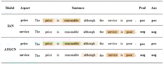 In order to understand more intuitively how ATGCN works, we adopt the example from the restaurant dataset as a case study. The case we chose has two aspects, namely price and service. In particular, we visualize in Figure 5 the attention scores of the IAN and ATGCN models for sentences and aspects, and their predictions for these examples. The attention weight assigned by the attention mechanism is represented by the depth of the color. The lighter the color, the lighter the weight. From the example, we can see that there are two aspects of “price” and “service” in the sentence. Both visualized models can accurately predict sentiment polarity. In the context, the common words “the” and punctuation marks “.” rarely attract attention. This shows that certain modifiers and punctuation can hardly determine the sentiment polarity of aspect terms. It is worth noting that in the ATGCN prediction, in addition to the word “reasonable”, the conjunction “although” was also noticed. This phenomenon suggests that our model captures both aspects of sentiment dependence through “although”. In other words, it not only pays attention to the corresponding word information for predicting the sentiment polarity of each aspect, but also considers the context information that helps to judge the relationship between different aspects. Therefore, we can model the interaction between context and aspect to capture perceptual dependencies.