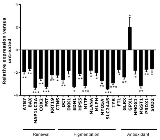A gene expression analysis was performed after repeated induction of oxidative stress on skin scalp explants. To explore the global effect of oxidative stress, we selected genes potentially responsible for canities development and involved in these three major functions: antioxidant activities, renewal, melanogenesis and related functions. In the category of renewal, we introduced hair cycle-related genes and genes involved in apoptosis and autophagy. The main objective of this study was to understand the impact of oxidative stress in the greying process that we hypothesised to be a key inducer. After the oxidative stress, the results in Figure 1 demonstrated a significant down-regulation of genes involved in autophagy (ATG7, MAP1LC3A). The significant down-regulation of KRT19, COX2, FST and BAX might describe a reduction of proliferation and the activation of stem cell quiescence. Moreover, the oxidative stress showed a clear effect on melanogenesis by down-regulating the expression of various genes directly linked to this synthesis (MITF, TYR, DKK1, EDN1) but also genes encoding for melanogenesis-related functions, such as melanosome formation and transfer (CTNS, HPS5, MLANA, MLPH, MYO5A, SLC24A5). The expression of the melanocyte precursor cell marker gene (DCT) was also significantly down-regulated. Finally, there was a significant negative impact on the expression of genes involved in antioxidant activities (FTL, GLRX, HMOX1, MGST1, PRDX1 and SOD2) even though the expression of GPX1 was activated. Overall, these results suggest that oxidative stress was able to induce a strong impact on renewal, pigmentation and antioxidant defence, which are the three main causes of canities development.