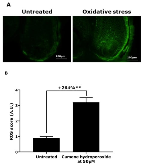Reactive oxygen species (ROS) production assessment following oxidative stress (cumene hydroperoxide at 50 µm) in hair follicles. (A) Representative images. Magnification: 20×. (B) Quantification of the mean fluorescence intensity (± SEM) of dichlorofluoerescein diacetate (DCFH-DA) probe. Statistical analysis was performed using one-way ANOVA with a permutation test followed by Tukey’s test, with ** p < 0.01.