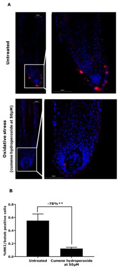 Pursuing our investigation further, we attempted to induce oxidative stress in microdissected hair follicles in order to confirm the hypothesis proposed following the gene expression results. After the stress, we observed a significant production of reactive oxygen species (ROS) inside the hair follicles, 264% in comparison with the untreated condition (Figure 2). Moreover, we evaluated the number of NKI/beteb-positive cells to observe the effect of oxidative stress on the melanocyte reservoirs. The counting of the red fluorescent cells showed a significant decrease by 78% of the number of NKI/beteb-positive cells compared with the untreated condition (Figure 3).