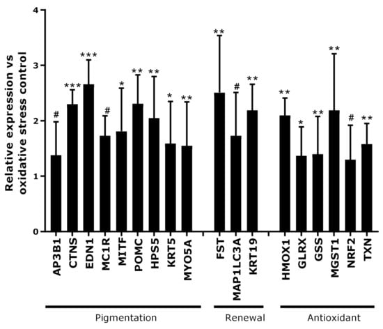 Gene expression analysis in scalp skin explants in a canities-induced condition following treatment with the active ingredient at 1%. The results (mean ± SEM) are expressed as relative expression versus the oxidative stress control condition. Statistical analysis was performed using one-way ANOVA followed by Fisher’s t-test in comparison with oxidative stress control condition, with # p < 0.1, * p < 0.05, ** p < 0.01 and *** p < 0.001.