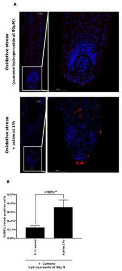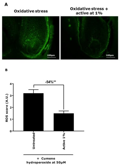 ROS production assessment in hair follicles in a canities-induced condition (cumene hydroperoxide at 50 µm) in the presence of active ingredient at 1%. (A) Representative images. Magnification: 20×. (B) Quantification of the mean fluorescence intensity (± SEM) of DCFH-DA probe. Statistical analysis was performed using one-way ANOVA with permutation test followed by Tukey’s test, with ** p < 0.01.