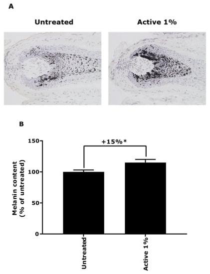 Evaluation of melanin content by Fontana-Masson staining of grey hair follicles treated with active ingredient at 1%. (A) Representative images. Magnification: 200×. (B) Results expressed as percentage of untreated condition (data are presented as mean ± SEM). Statistical analysis was performed using a Student’s t-test, with * p < 0.05.