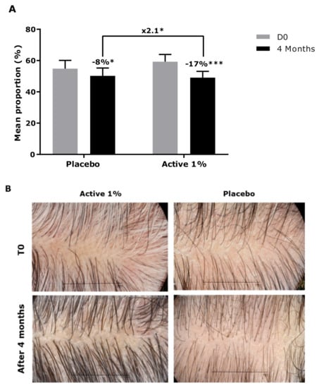 We then carried out a clinical study with double-blind and placebo-controlled conditions. A panel of 44 male volunteers presenting 30% to 95% of grey hair, randomly distributed in two groups, was used. In this study, the canities was firstly analysed by scoring the proportion of grey hair using a specific scale before and after product application. We can observe in Figure 8 that after 4 months of daily application, the proportion of grey hair was significantly reduced by the active product, showing −17%, while the placebo evidenced a lower efficacy, with only 8%. Moreover, we demonstrated that the active product was significantly more efficient than placebo, as observed by a significant 2.1-fold reduction of the proportion of grey hair after 4 months of application. The representative images in Figure 8 show this clear effect, observed with the net reduction of the proportion of grey hair after 4 months of application of active product.