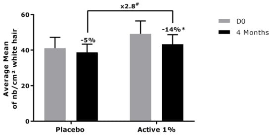 The measure of grey hair density, which is a more quantitative method represented by the number of grey hairs per cm2, was performed on the volunteers. In Figure 9, the results showed that after 4 months of active product application, the number of grey hairs per cm2 was significantly reduced by 14%, while the placebo application evidenced only a slight and not significant reduction of 5%. Interestingly, the active product showed a better and significant reduction of grey hair density than the placebo, with an efficacy that was 2.8 times higher (Figure 9).