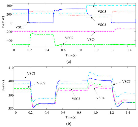 As shown in Figure 9a,b, when t = 0.2 s, the master converter is blocked, and active power is decreased to zero immediately. DC unbalance power occurs when the auxiliary converter reaches its maximum capacity. The final unbalanced power is 251 MW, and the operation mode will turn into VSC2 priority mode. According to equation (15), UdcL2 of VSC2 is 391 kV. Then Udcl2 of the VSC2 is set at 379 kV as the result of a security margin for DC voltage control of VSC4. The DC unbalanced power is absorbed by VSC2 independently. Under VSC2 priority mode, the DC voltage will rapidly reduce until VSC2 turns into droop control, and then DC voltage is always within the security range.