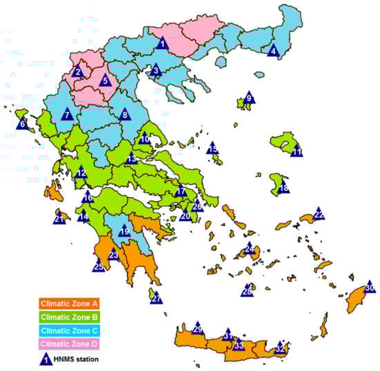 Distribution of the 33 selected HNMS stations (blue triangles) across the 4 climatic zones of Greece for energy purposes (orange = climatic zone A, green = climatic zone B, blue = climatic zone C, and purple = climatic zone D). The numbers on the map inside the triangles refer to the HNMS stations.