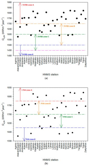 Solar energy yield per year on a horizontal plane Ge,0S at each selected site of the HNMS meteorological network. The graph includes (a) the four TOTEE zones and (b) the four PV0 zones, shown by single-arrowhead or double-arrowhead lines.