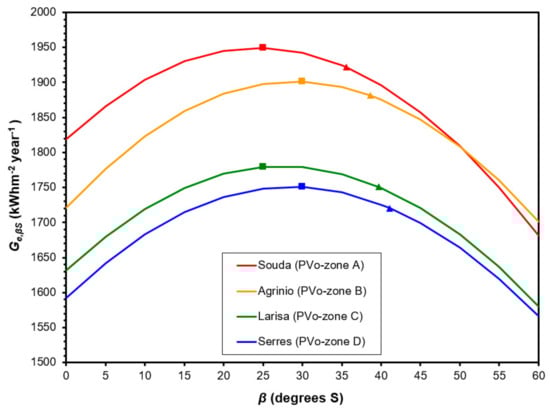 Solar energy yield per year Ge,βS on the planes with tilt angles to the south in the range of 5–60° in steps of 5° at four representative sites in Greece. The maximum energy received per year in each site is presented by squares, and the energy received at tilt angles equal to φ° is shown by triangles. The energy received by a horizontal flat plane (β = 0°) is also shown.