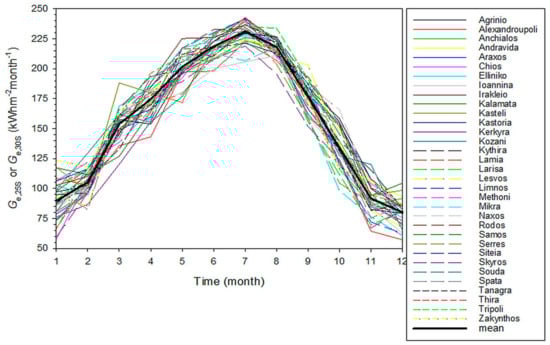 Section 3.1 demonstrated that the optimum tilt angle for the maximum annual solar energy received on an inclined plane in Greece is either 25° or 30° to the south. Apart from the annual energy yield, a solar energy investor is also concerned about the monthly solar energy availability at the site of interest. Therefore, the analysis in the present section is concentrated on the monthly energy received by flat planes with inclinations of 25° S or 30° S without discrimination. For this reason, Figure 6 has been prepared to show the intra-annual variation of the total energy yield from solar convertors inclined at 25° or 30° to the south at all 33 sites. It is seen that the variation was limited between a low of 50 kWhm−2·month−1 and a high of 250 kWhm−2·month−1. The graph is not intended to show the intra-annual variation of individual sites, but rather its variation as an ensemble.