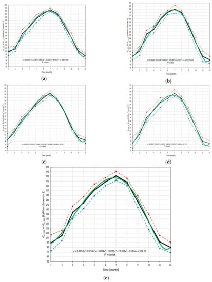 Intra-annual variation of the Ge,25S or Ge,30S sums for all sites in PVctts zone A (a), PVctts zone B (b), PVctts zone C (c), PVctts zone D (d), and all PVctts zones (e). The black solid curve represents the average monthly Ge values in every PVctts zone or all PVctts zones, while the green solid line shows the best-fit curve to the mean Ge values. The dashed lines correspond to +1σ (red curve) and −1σ (blue curve). The best-fit equations are functions of y = Ge,25S or Ge,30S in terms of x = month of the year (1, …, 12). R2 is also given.