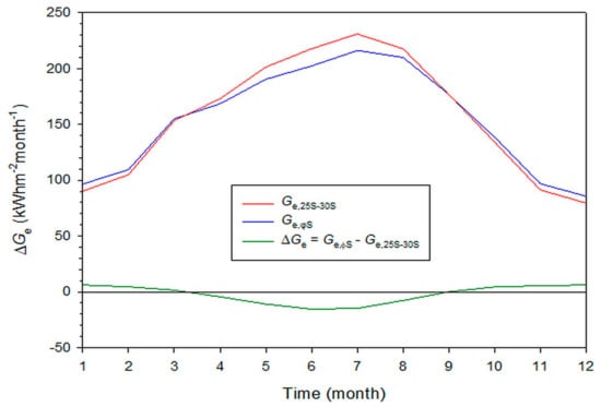 One might wonder why a tilt angle of φ° has not been shown to be optimal in the analysis. To clarify this question, Figure 8 presents the variation of the monthly mean Ge,25S–30S and Ge,φS sum values together with their difference ΔGe. This graph unambiguously confirms the main conclusion of the present work: the choice of the optimum tilt angles of 25° S or 30° S for the maximum solar energy availability on inclined solar convertors in Greece provided a higher yield than the believed yield at a tilt angle of β = φ°. Further proof of that are the insignificant monthly ΔGe values, which were negative for most of the year. The algebraic summation of all these differences gives the amount of ΔGe = −813.73 kWhm−2·year−1. This means that by using solar convertors in Greece with tilt angles of 25° S or 30° S, the annual mean solar energy gain is 813.73 kWhm−2·year−1, in respect to a tilt angle of φ°. This amount is almost half of the annual solar energy production at any of the 33 sites in Greece (compare the values in Figure 5). This further implies that the use of solar panels inclined at the above tilt angles to the south in Greece resulted in gaining solar energy of an extra half-year in a whole year, so it was as if the year consisted of 18 months. The above factors lead to the conclusion that the adoption of solar panels with a tilt angle equal to either 25° or 30° oriented to the south gives the best results in terms of received solar energy in Greece.