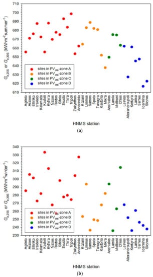 Figure 9a,b presents the total solar energy received on a flat solar convector inclined at 25° or 30° to the south under all-sky conditions during summer and winter, respectively. The energy values are the sums for each season (summer (JJA) and winter (DJF)) in every site. It is interesting to see that the dispersion of the seasonal energy sums among the 33 locations was great. Moreover, there were sites that belonged to a lower PVctts zone but showed solar availability corresponding to a higher PVctts zone. Nevertheless, in both cases, a decreasing trend was observed from PVctts zone A to PVctts zone D sites. Because of this great dispersion, no specific thresholds could be applied to the summer and winter seasons, as was done with the annual energy sums.