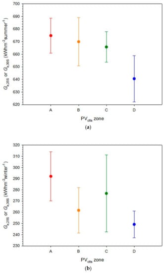 Figure 10a,b shows the seasonal sum values of Ge,25S or Ge,30S for every PVctts zone averaged over all sites that belonged to the same zone. It is easy to conclude that the hierarchy of higher to lower seasonal energy yields was fulfilled in the summer, but this was not the case in winter. Here, the energy totals in zones B and C were interchanged (i.e., the winter mean Ge value in zone C was higher than that in zone B). Besides this discrepancy, this winter abnormality between zones B and C seemed to not have an effect on the annual solar availability at the sites belonging to these two zones, as far as the decreasing trend from B to C is concerned. Additionally, the spring and autumn mean Ge values (not shown here) followed a decreasing trend from zone A to zone D.