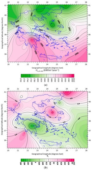 Figure 11a shows the spatial distribution of the annual mean Ge,25S-30S sums over Greece, while Figure 11b (adopted from Kambezidis and Psiloglou []) gives the distribution of the annual mean Linke turbidity factor TL over Greece. From both figures, it is interesting to observe that where the maximum Ge values occurred, the minimum TL values existed. This is obvious, since TL expresses the clarity of the atmosphere in terms of the aerosol loading in the atmosphere. From Figure 11a, the lines dividing the four PVctts zones can be identified (see the legend).